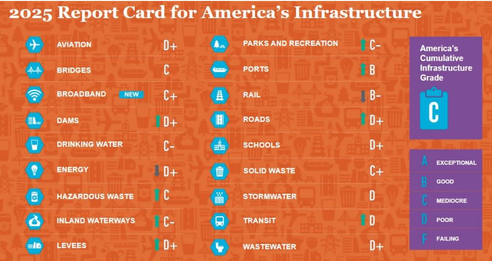 In their 2025 Infrastructure Report Card, the American Society of Civil Engineers (ASCE) gives US public infrastructure a “C” grade and emphasizes that improving infrastructure isn’t just about new construction—it’s about better management of existing assets, adherence to modern building codes, and basing capital decisions on high-quality public data.